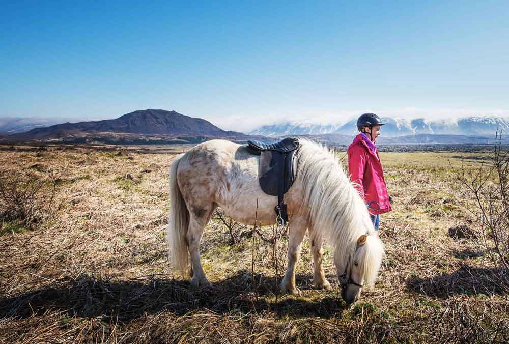 We start the day at Íshestar farm where we saddle up and go for a classic horseback riding adventure. We will explore the lava surrounding Mt. Helgafell volcano while riding through vast lava fields and across beautiful hillsides to Lake Hvaleyrarvatn. As we ride through this stunning scenery you will have the chance to see all of the different formations in the rough lava. The horses stroll along perfectly safe riding paths with the beautiful Bláfjöll Mountains towering above the horizon.
