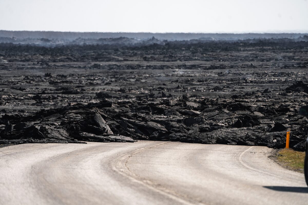 The valley is now shaped by fresh lava fields, where hardened black rock marks the furthest points reached by flowing lava. A short hike leads to a higher viewpoint, providing a clear look across the dark lava flows set against the surrounding green hills.