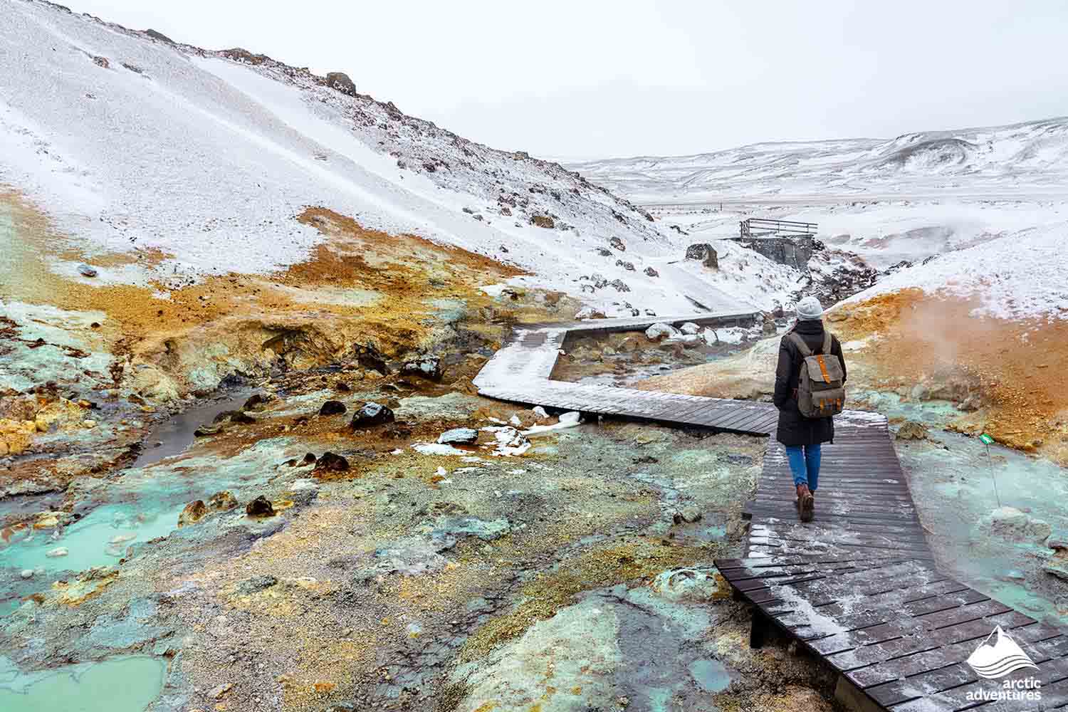 Depending on our schedule, we'll explore Seltún. When visiting this area, you will learn about the dramatic effects of geothermal forces. Here, steaming mud pools and sulfuric hot springs create a moon-like landscape.
