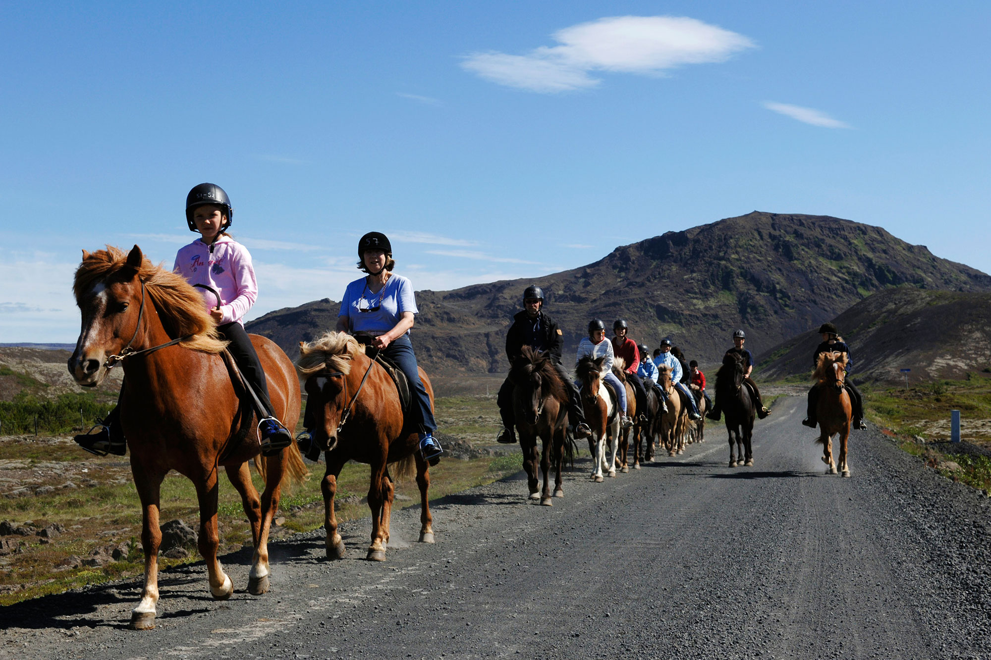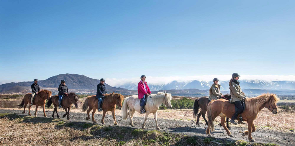 Our horse riding adventure starts at Íshestar stables, where we saddle up on the beautiful Icelandic horses. We go for a great stroll into the lava surrounding Mt. Helgafell volcano and continue on through lava fields and across beautiful hillsides to the old Kaldársel sheep corral. As we ride through this majestic scenery, you will see different unique formations in the rough lava and the Bláfjöll Mountains towering above on the horizon. The horses follow safe paths through the beautiful countryside to give you a fun and peaceful horseback experience in Iceland.