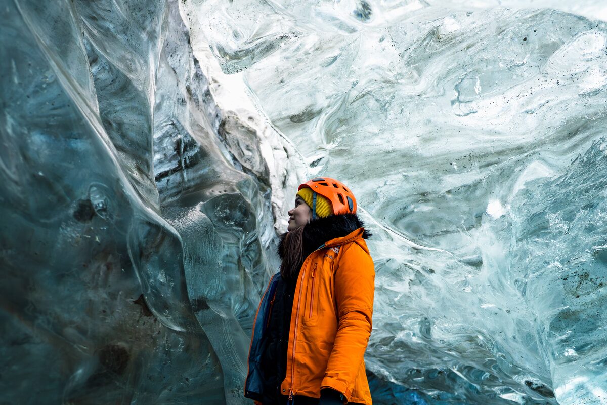 The Into the Glacier tour departs from the Glacier Guides booking hut in Skaftafell National Park and is up to 4 hours in duration. After gearing up for our glacier adventure, we jump on a bus for a short drive to Falljökull glacier (approx. 15-20 minutes). This tour is perfect for those looking to try hiking on a glacier, exploring the crevasses and fascinating ice formations as well as experience what it’s like to be inside a glacier ice cave. This tour is rated easy (2 / 5) and no prior glacier experience is needed to participate on the tour. Participants need to be in good walking condition and be able to walk for 1.5 – 2 hours at a low pace with short breaks.