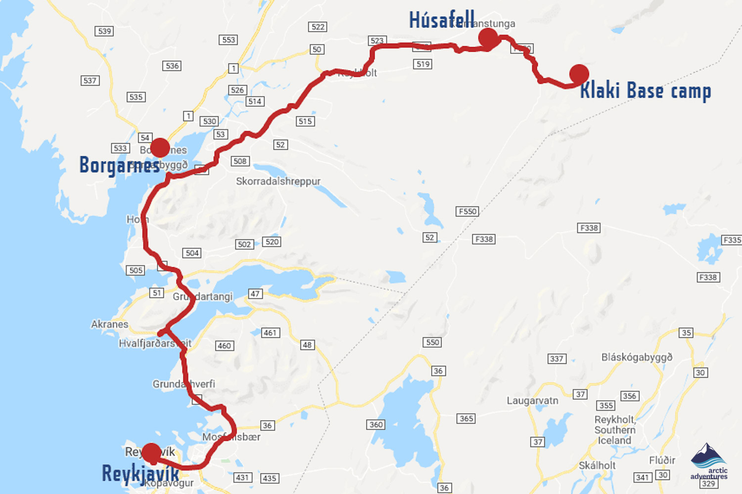 The drive from Reykjavík to Klaki Base Camp starts out the same as the drive to Húsafell. Out from Reykjavík via road 1, through the undersea tunnel in Hvalfjörður and right before reaching Borgarfjörður you make a right turn to Road 50. Continue on this road. After a few miles, it will change to 518, but you should carry on past Deildartunguhver, Reykholt and Húsafell.