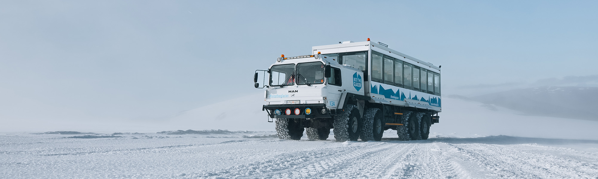 The specially modified glacier vehicle features tires that can be inflated and deflated while driving, allowing it to traverse rocky glacier ice with ease. Without the help of this machine, it would be impossible to take visitors to the Langjokull Glacier ice cave.