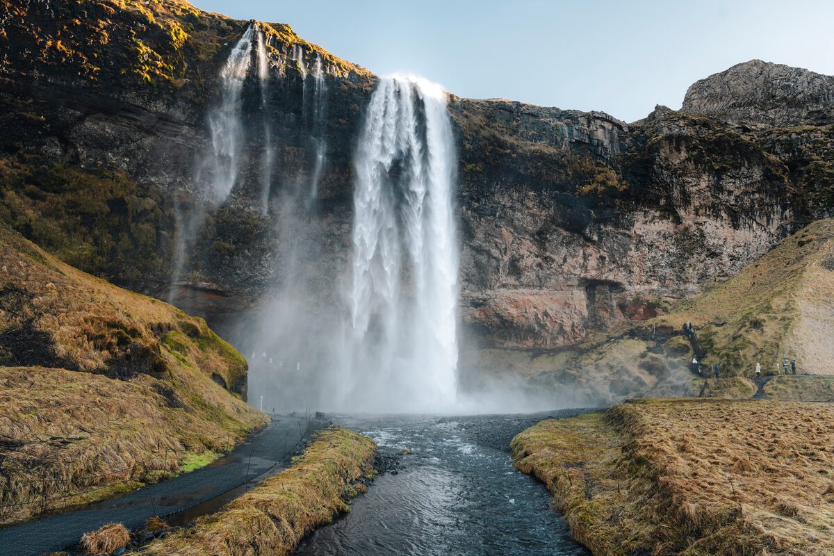 Seljalandsfoss is one of Iceland’s most famous waterfalls. It is very photogenic as it plunges over 60m into a shallow pool. The river that feeds Seljalandsfoss originates at the magnificent volcano glacier, Eyjafjallajokull. But the main reason why this cascade is so unique is that you can walk behind the water flow and see the waterfall and the world from a new perspective. Bring your raincoat as you will get wet from the drizzle! (Please note that the path behind the cascade may be closed during winter as it gets too slippery and dangerous.)