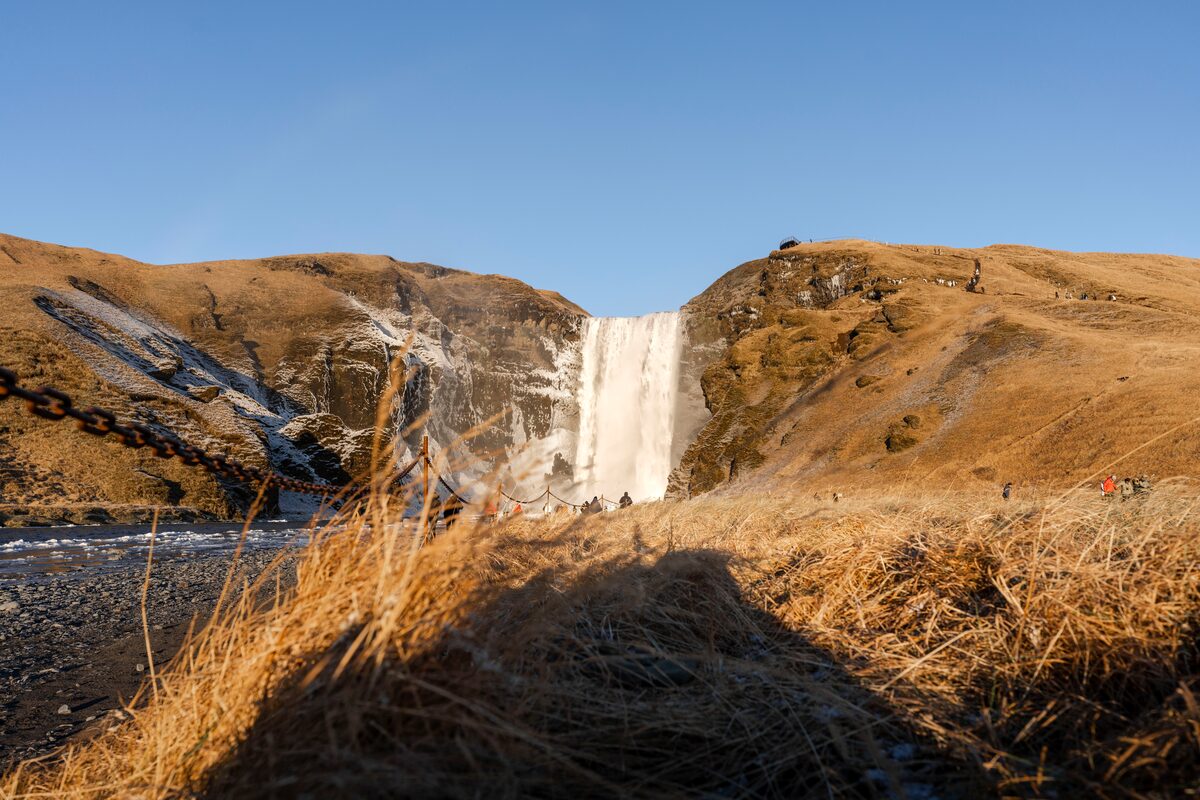 On the way back, we stop at Skógafoss, one of Iceland’s most breathtaking waterfalls. This 65-meter (213-foot) cascade crashes down with immense force, creating a constant mist that often forms vibrant rainbows on sunny days. If you’re feeling adventurous, climb the 527 steps to the viewing platform for a stunning perspective from above. The view is worth every step!