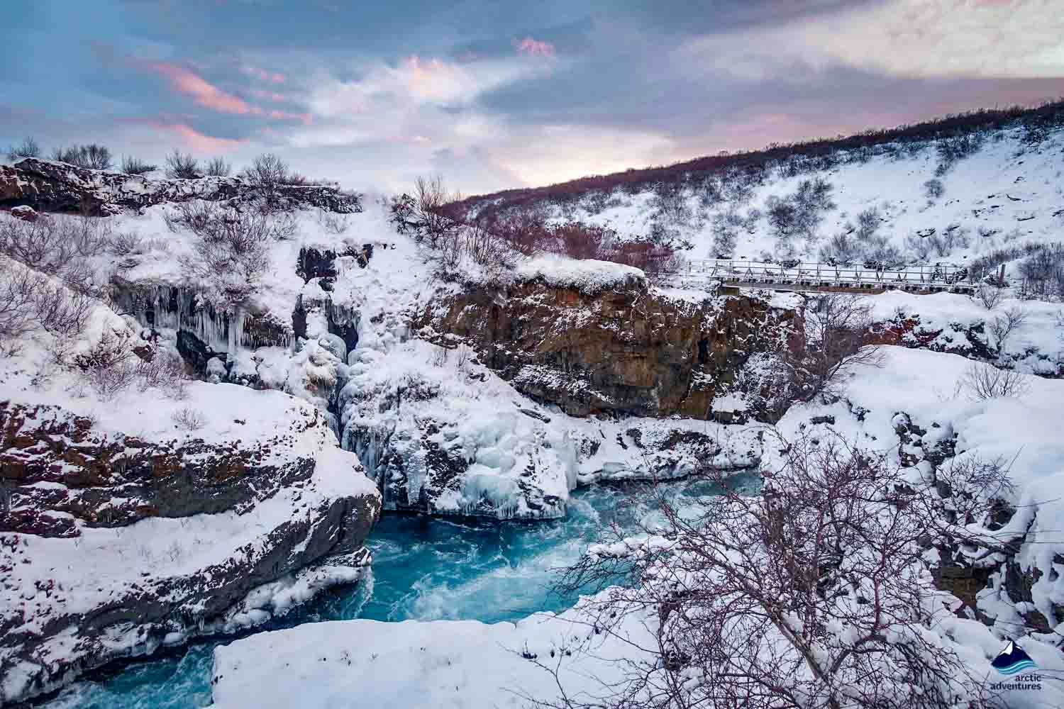 We’ll drive inland to the Hraunfossar and Barnafossar waterfalls – two stunningly beautiful waterfalls that are the pride of west Iceland. Hraunfossar is particularly special – comprised of thousands of tiny cascades that combine into a dramatic cacophony of thundering water. These rivulets emerge from the colorful Hallmundarhraun lava field – making for one of the best photo opportunities that you will ever get! We’ll also stop at Barnafossar, whose beautiful foggy blue waters have a supernatural quality about them. They are known as ‘the children’s falls’ and your knowledgeable local guide will tell you all about the tragic story that earnt them this name.