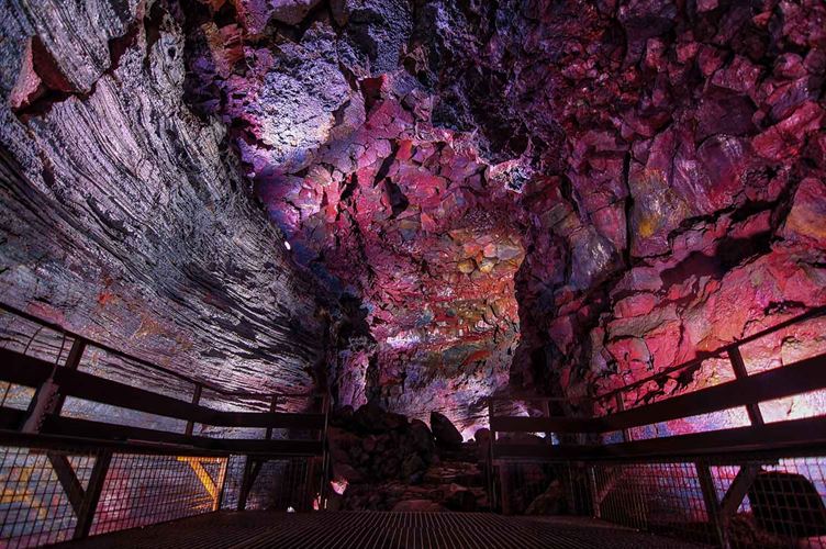 The lights illuminate the most spectacular parts of the cave, revealing its magic. The cave walls are rainbow-colored with emerald, ruby, turquoise, and lilac shades from the mineral deposits. The knowledgeable and friendly guide will tell you how the volcanic activity shaped this cave and how it gained its tubular structure.