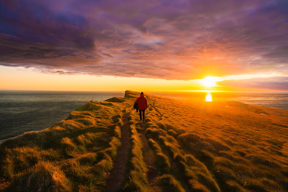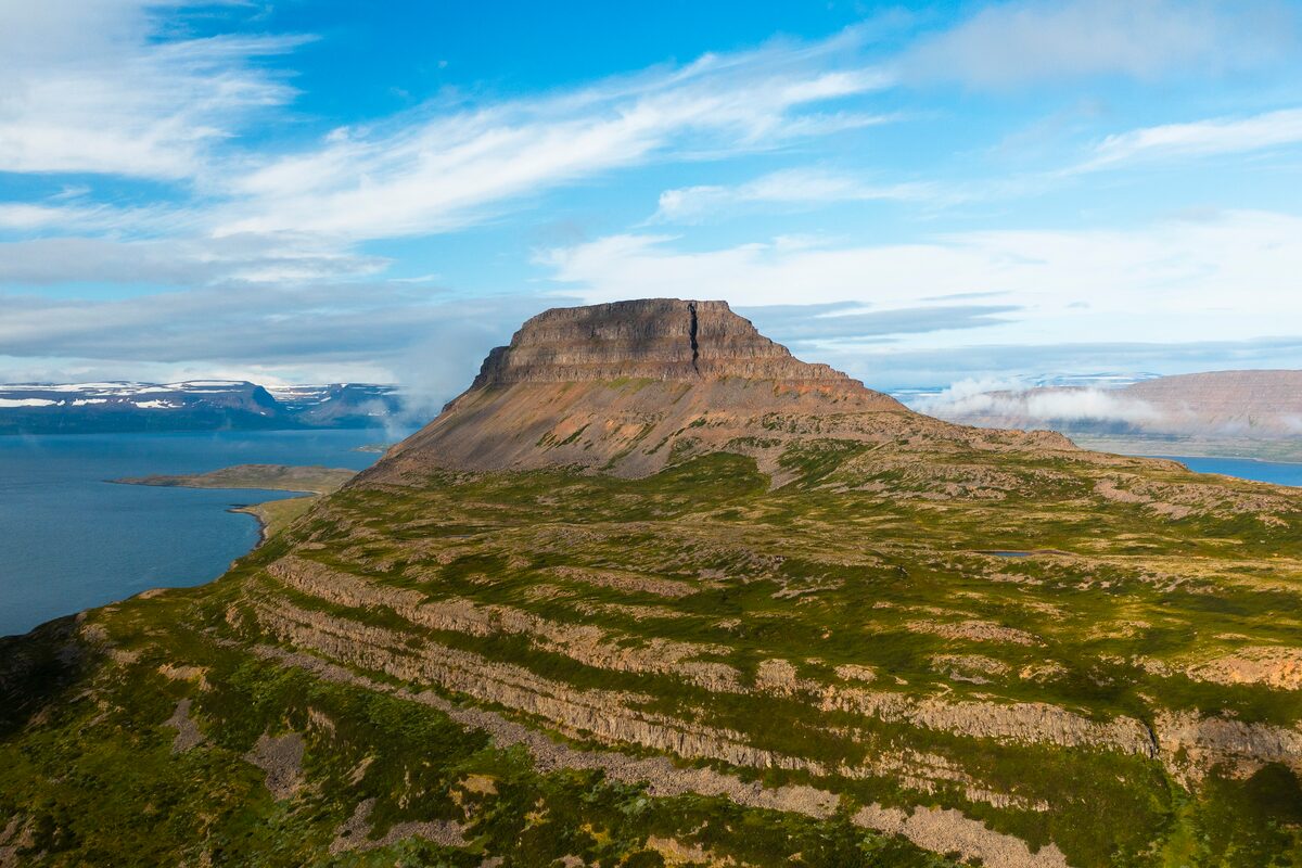The route then leads to Látrabjarg, the largest seabird cliffs in Europe. Here, walls of rock rise above the meeting point of the Arctic and Atlantic Oceans. In summer, puffins often stand watch along the grassy ledges.