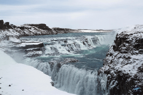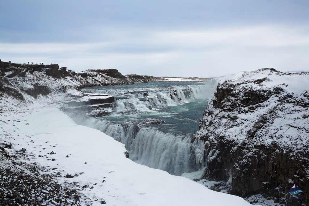 The final stop on the Golden Circle route is Gullfoss (or “the Golden Falls”) – a stunningly beautiful two-stage waterfall that gets its name from the golden color its water takes as it cascades over the dark brown rock. Beneath it is an emerald valley, and rainbows regularly form above it – making for an awe-inspiring scene.