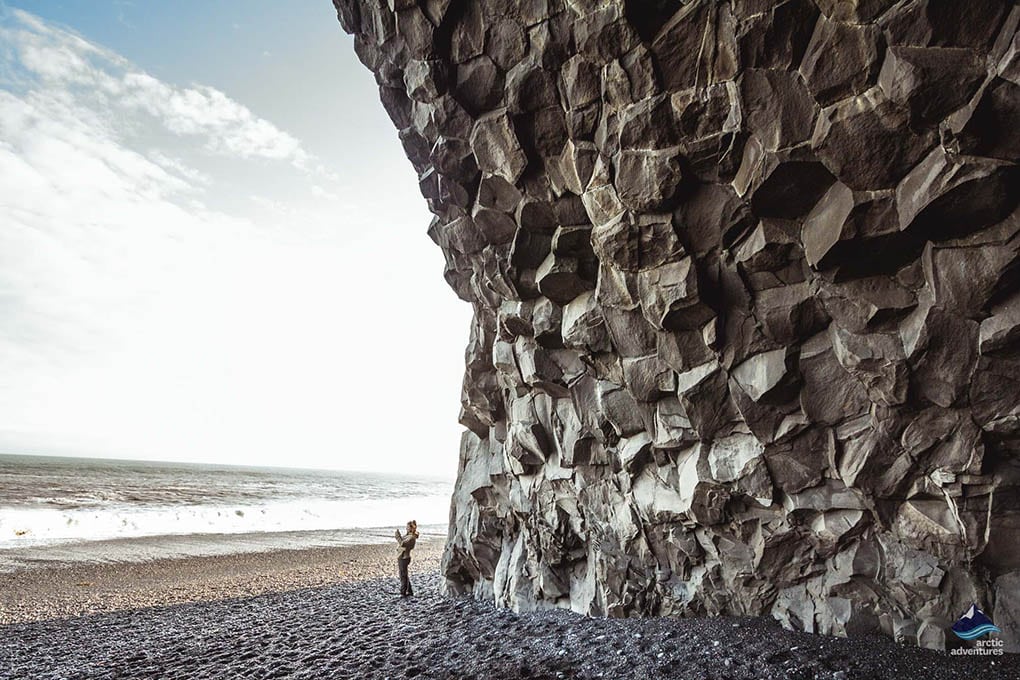 The day ends at the Reynisfjara Black Sand Beach, with its towering basalt cliffs, sea caves, and wave-pounded shoreline. Offshore, the Reynisdrangar sea stacks rise from the ocean—legend says they were trolls caught by the morning sun.
