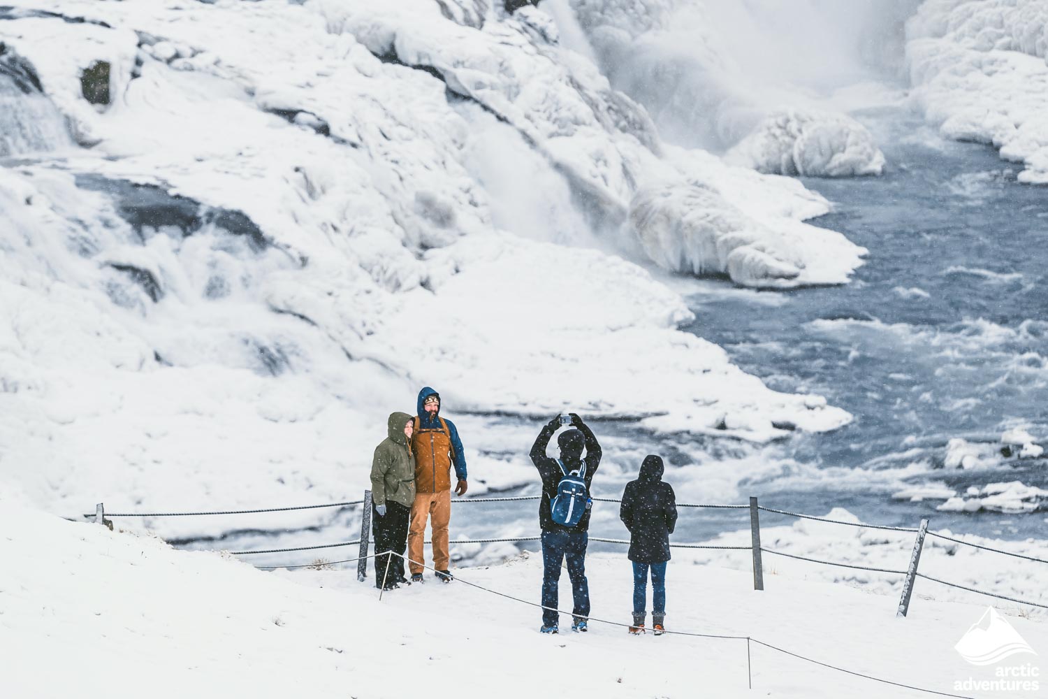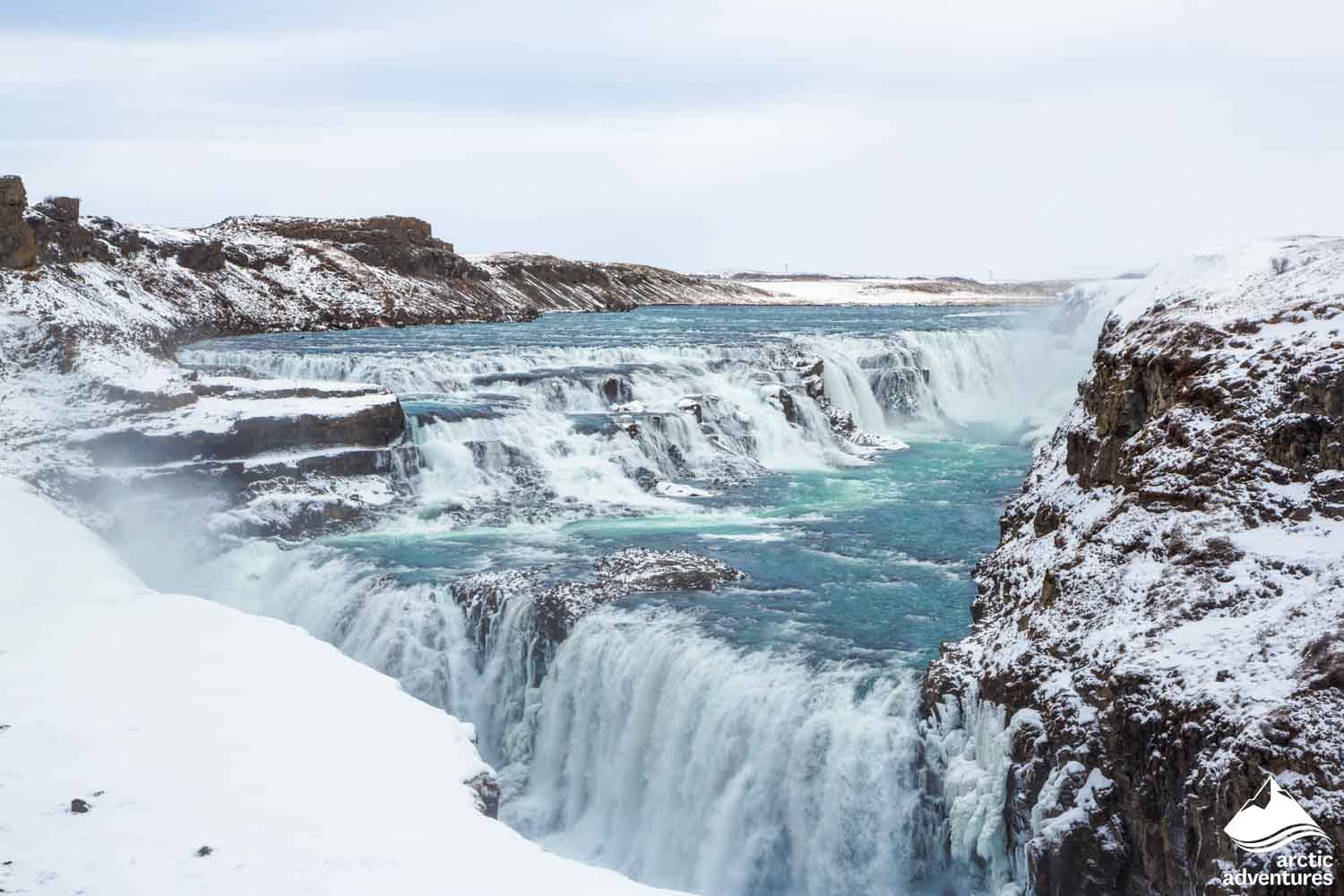We first stop at Gullfoss (“the golden falls”), where a narrow winding path leads you to the main stage of the two-tiered waterfall. Located in the mammoth Hvítá river canyon, the cascade begins at the Langjökull glacier and leads into dramatic cascades down Gullfoss.