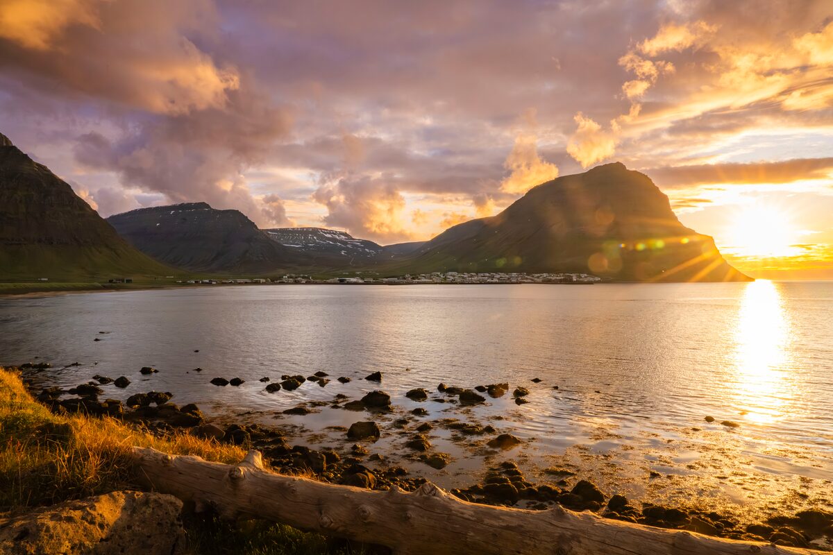 Our journey continues into the Fossfjörður valley and Dynjandi waterfall. This waterfall is the largest in the Westfjords. It’s a multi-tiered cascade, with a short walking path and several viewpoints along the way. Then, on to the Önundarfjörður pier, a simple wooden walkway reaching into the fjord. With turquoise water, pale sand, and mountains all around, it’s an excellent place to slow down for a bit.