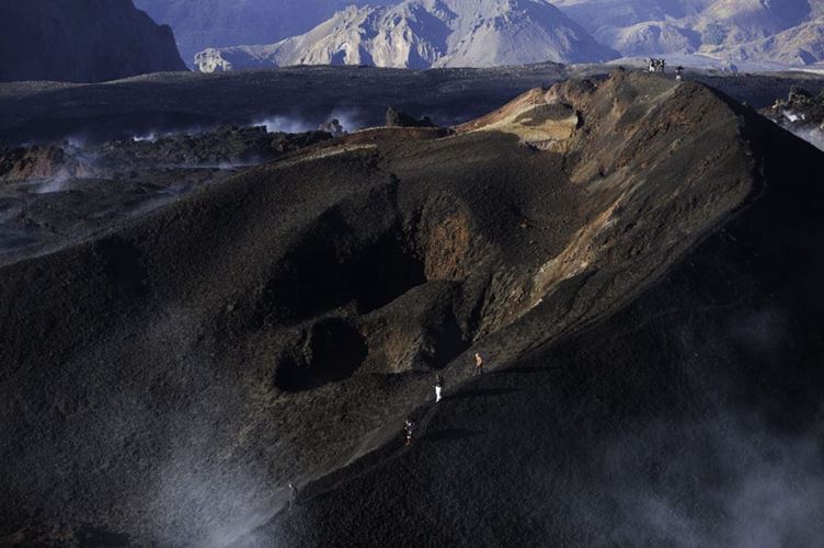 We’ll start the day navigating through the Laugahraun lava field, a rugged path shaped by past eruptions. From there, the trail winds past the colorful slopes of Brennisteinsalda and toward the steaming Reykjafjöll rhyolite mountains. We’ll climb through narrow gorges, walk by the bubbling Stórihver hot spring, and follow ridgelines painted in vivid yellows by geothermal activity. The landscape soon shifts dramatically to the black obsidian desert of Hrafntinnusker, where we’ll pause to enjoy lunch in this unique terrain.