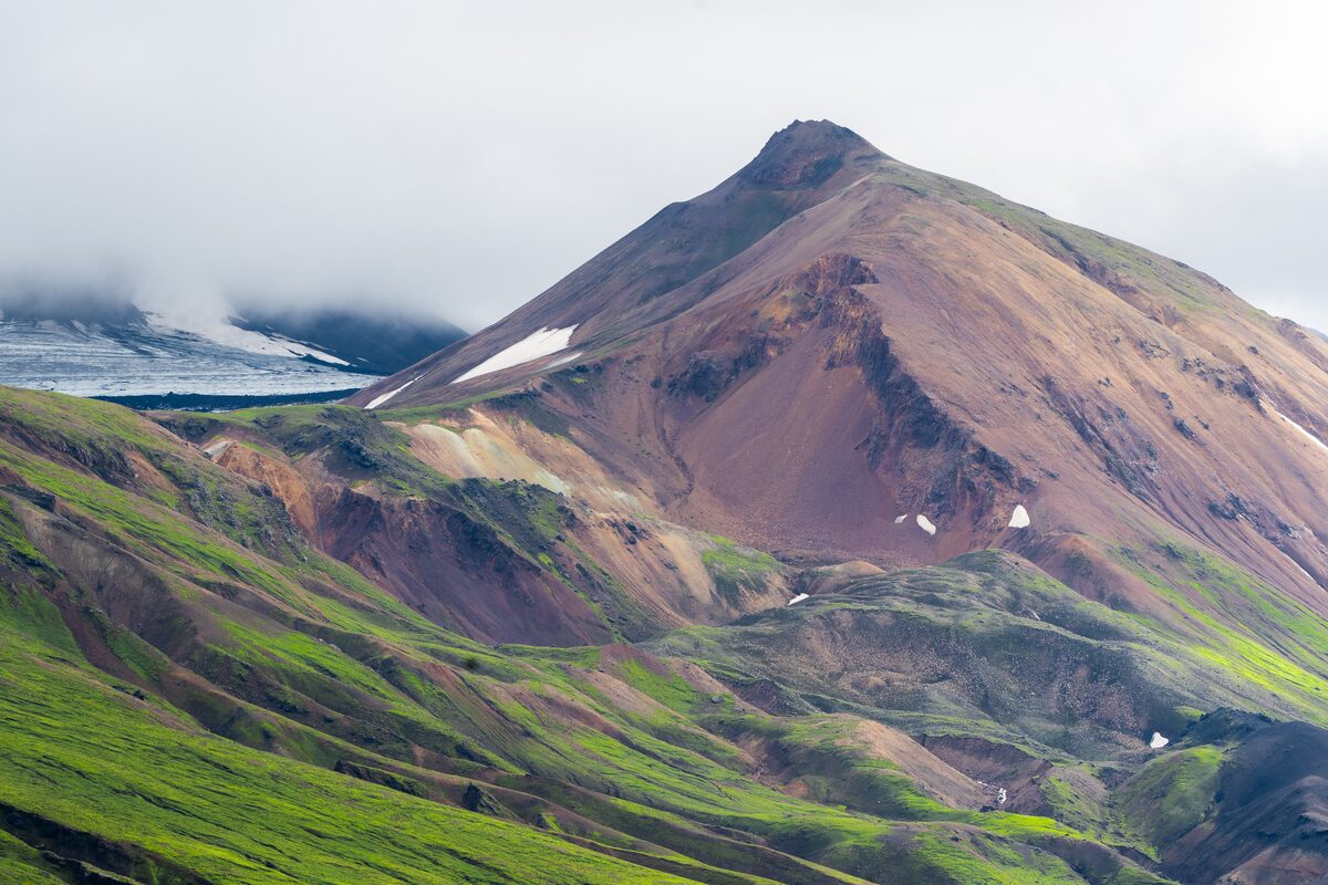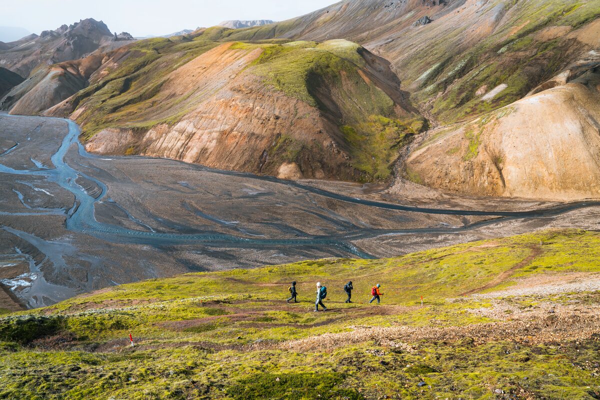 The starting location for the Laugavegur trek is Landmannalaugar. We’ll hike through Vondugil Canyon and Laugahraun Lava Field, whose barren features perfectly contrast the beautifully colorful rhyolite mountains and volcanoes like Brennisteinsalda. If the time allows, we’ll visit the Graenagil Gorge and Bláhnjúkur Volcano.