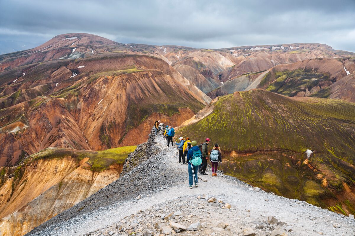 The Laugavegur Trail starts in the vibrant geothermal region of Landmannalaugar. Before jumping into the full trek, you’ll spend the first day on a warm-up hike to get your legs moving and ready for the days ahead. This scenic loop winds through some of the area’s most unforgettable terrain, including the surreal Laugahraun lava field, the colorful Grænagil gorge, and the impressive Bláhnjúkur volcano. It’s the ideal way to settle into the rhythm of the trail while taking in the raw beauty of the landscape.