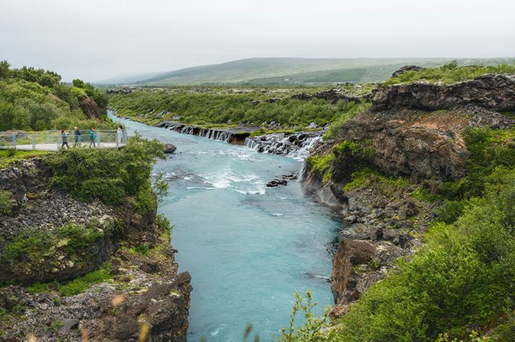 Next, you’ll visit two beautiful waterfalls that are very close to each other. Hraunfossar has countless streams that flow out of the lava fields in the middle of the vegetation. This is how the waterfall got its name, which translates as the “lava waterfall”. No matter if it’s summer or winter, Hraunfossar always has something unique to show visitors. A few minutes walk away, you’ll find Barnafoss waterfall forcefully cascading down into a small canyon. The entire area is fabulous, especially in autumn.