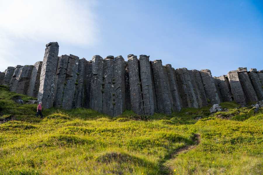 First, you’ll arrive at Gerduberg Cliff, a gigantic wall of huge basalt columns rising 14 m (46 ft) from the ground. The style is like nothing that you have already seen in Iceland. Its sheer size alone makes this cliff overwhelmingly impressive.