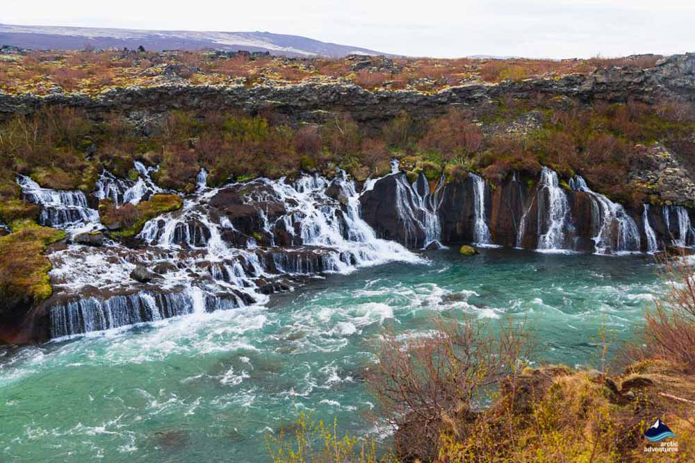 Next, you’ll visit two beautiful waterfalls that are very close to each other. Hraunfossar has countless streams that flow out of the lava fields in the middle of the vegetation. This is how the waterfall got its name, which translates as the “lava waterfall”. No matter if it’s summer or winter, Hraunfossar always has something unique to show visitors. A few minutes walk away, you’ll find Barnafoss waterfall forcefully cascading down into a small canyon. The entire area is fabulous, especially in autumn.