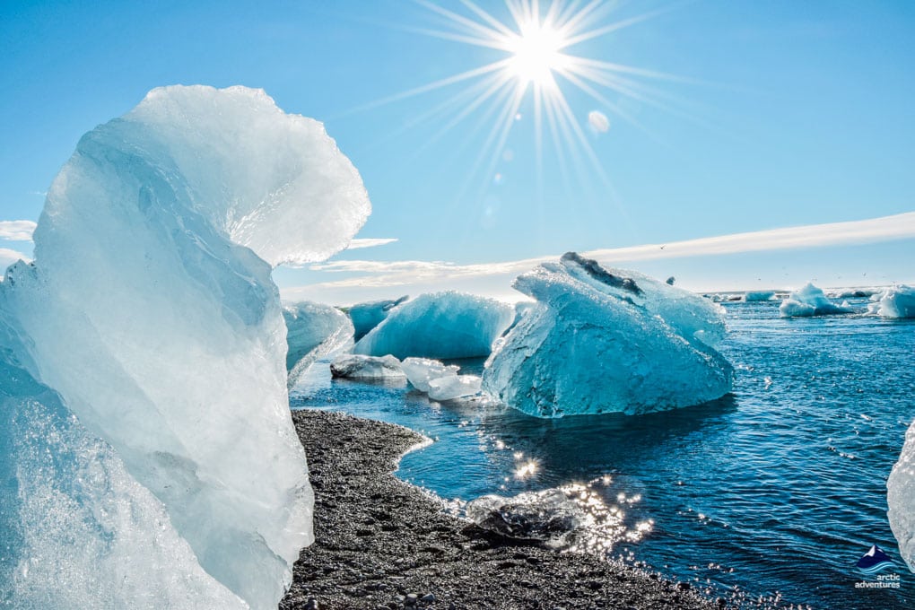 The next part of the route will take you to the legendary Jökulsárlón Glacier Lagoon, which is undoubtedly one of the most beautiful natural wonders in the world. It is renowned for the gleaming chunks of glassy ice that float across its turquoise surface, a spellbinding sight that words really don’t do justice. Film buffs may recognize it from films like Die Another Day, Batman Begins, Tomb Raider and more. This incredible natural wonder might even be topped by the iconic Diamond Beach which lies just below it. Here gleaming diamond-like icebergs sparkle like jewels on the dark black volcanic sands.